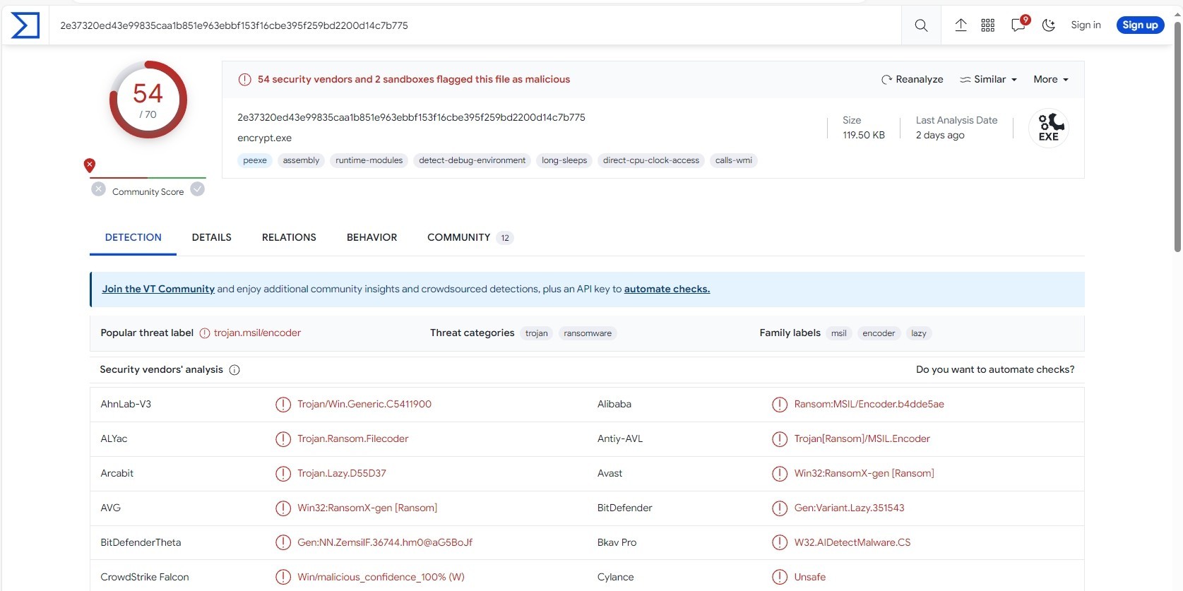 A basic analysis of CryptNet has revealed that 54 out of 70 security vendors detected the ransomware sample as malicious. The ransomware is a .NET executable that has not been packed. Deobfuscation using NETReactorSlayer has revealed clearer code.