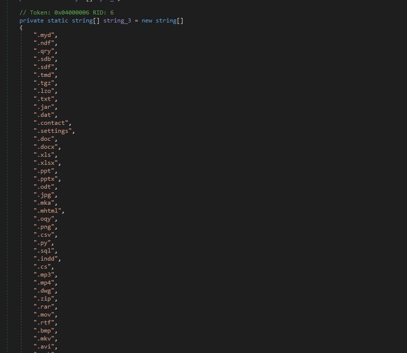 If we go up, we can see the file extensions that will be encrypted by the ransomware.