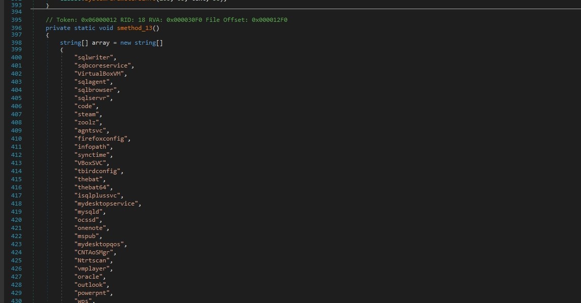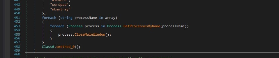 The function begins by defining an array of strings named array. Each string in this array represents the name of a process. Then iterates over each string in the array using a foreach loop. For each string (process name) in the array, it attempts to find and terminate the corresponding process running on the system.