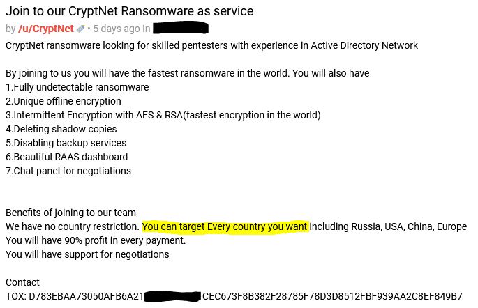 According to RAKESH KRISHNAN CryptNET threat group are looking on criminal forums for pentesters with experience in Active Directory Network.