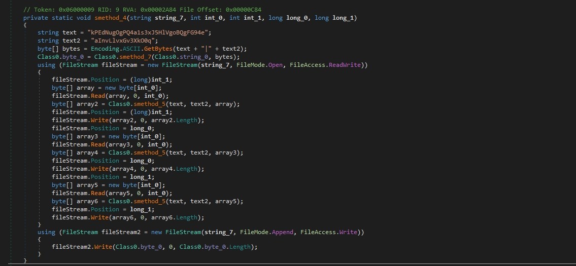 This function uses a smethod_5 to encrypt parts of the file specified by positions and sizes. Then it overwrites the encrypted data to the file.