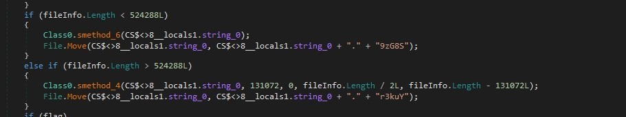 If a file is less than 524288 bytes, the malware will encrypt it entirely. If it’s larger, the malware will split it into three parts and encrypt a portion of each part.