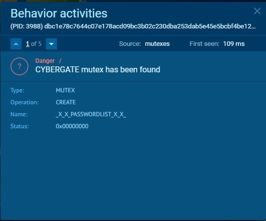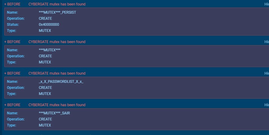 CyberGate creates mutexes to avoid running multiple instances of it at the same time.