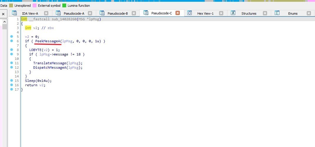 The function checks for a Windows message using PeekMessageA. If a message is found and it is not WM_QUIT, the message is translated and dispatched Then it sleeps for 20 milliseconds to avoid busy-waiting and to give other processes some CPU time.