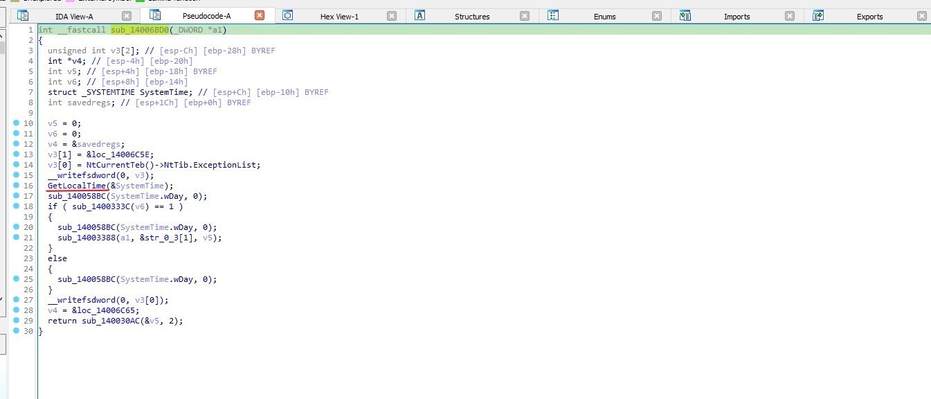 In sub_14006BD0 it fetches the current local time and stores it in the SystemTime structure.