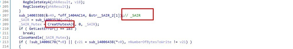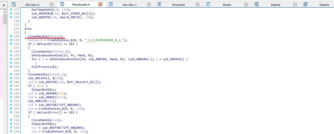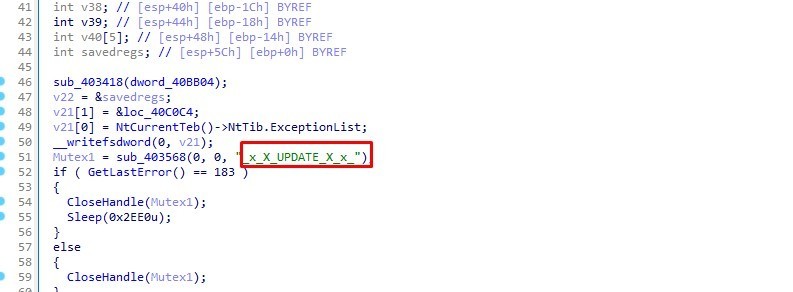 If it does (error code 183), it closes the mutex handle and sleeps for 12 seconds