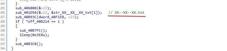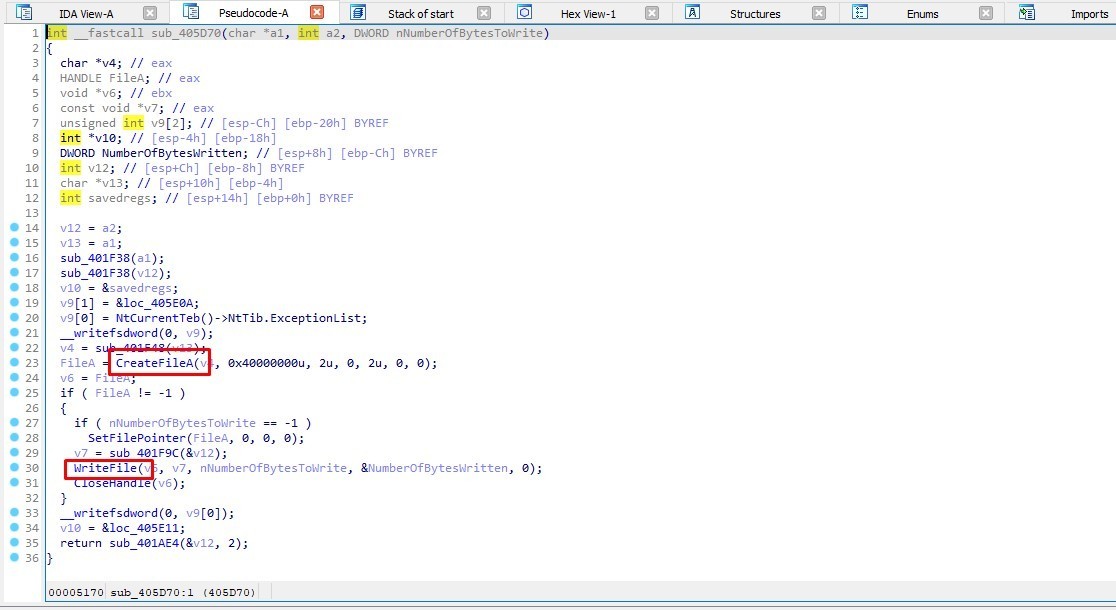 The function sub_405D70 in sub_40B93C, creates and writes a file named XX–XX–XX.txt (which we took a look on it before) by using CreateFileA and WriteFile APIs
