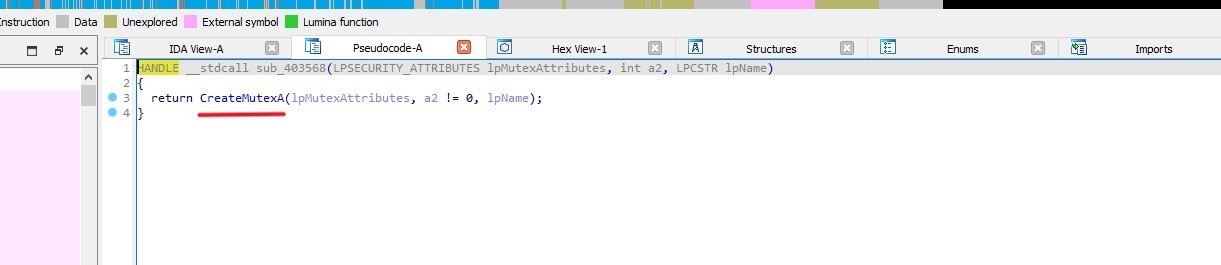 In the most cases this mutex will not exists, so the malware will jump to 0x0040BFA0 address