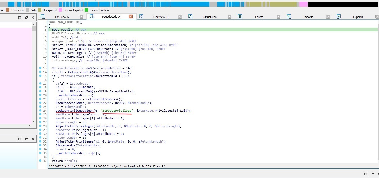 Then it uses LookupPrivilegeValueA, “SeDebugPrivilege”