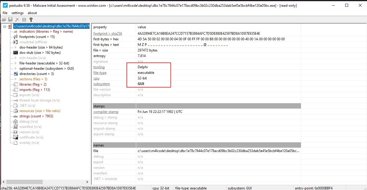 The malware is 32bit and it is written in Delphi, as you can see in the image above.