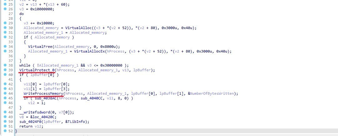 The function has loop attempts to allocate virtual memory by using VirtualAlloc, then tries to allocate memory in the process using VirtualAllocEx. This loop continues until it successfully allocates memory (v5) or v3 exceeds 0x30000000 bytes.